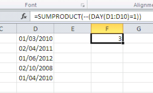 For Example: =SUMPRODUCT(–(DAY(D1:D10)=1))